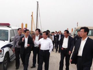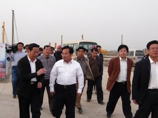 2008年4月14日,濰坊市委書記張新起視察集團(tuán)公司施工中的奧體中心工程。集團(tuán)公司總經(jīng)理朱九洲(左上圖左三)陪同張書記視察 |