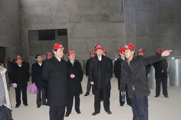 董事長徐鵬強(qiáng)(前排右一)向許立全書記(前排左一)等領(lǐng)導(dǎo)介紹工程建設(shè)情況