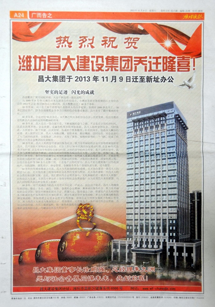 2013年11月09日,集團(tuán)喬遷至高新區(qū)健康東街6999號(hào),濰坊日?qǐng)?bào)、濰坊晚報(bào)刊登集團(tuán)喬遷慶典的報(bào)道。