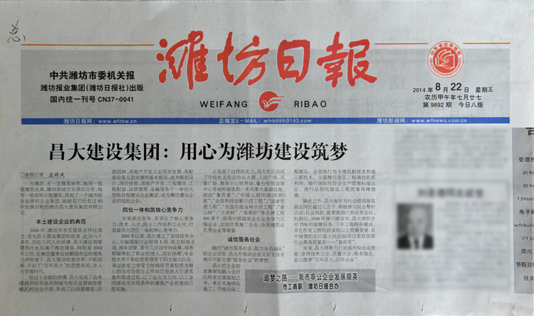 《昌大建設(shè)集團(tuán)——用心為濰坊建設(shè)筑夢》——濰坊日報2014年8月22日第二版