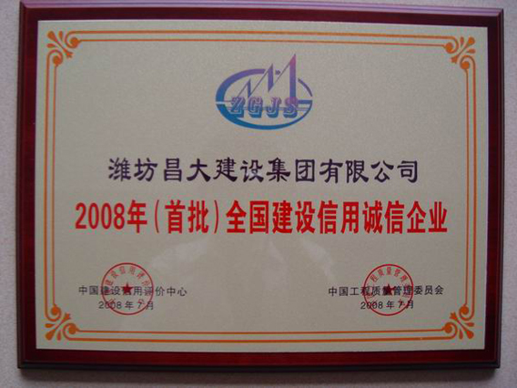 濰坊昌大建設(shè)集團(tuán)被授予“2008年(首批)全國建設(shè)信用誠信企業(yè)”