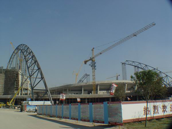 上圖為適時施工中的奧體中心體育場工程