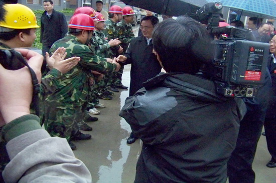 4月13日下午,春雨綿綿,中共中央政治局常委、中央紀(jì)律檢查委員會(huì)書記賀國(guó)強(qiáng)在有關(guān)人員陪同下,冒雨視察了北川新縣城援建工作。在集團(tuán)公司援建的溫泉一期安居房工程現(xiàn)場(chǎng),賀國(guó)強(qiáng)走進(jìn)住宅樓實(shí)地察看已經(jīng)建好的新居,非常高興,對(duì)山東省濰坊市援建的安居房工程給予很高的評(píng)價(jià),贊揚(yáng)山東省濰坊市的援建隊(duì)伍是一支能打硬仗的施工隊(duì)伍,他感謝在援建工作中作出辛苦努力的所有援建人員,并預(yù)祝圓滿完成援建任務(wù)。