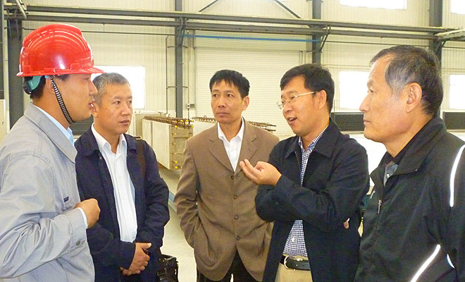 上圖為徐鵬強(qiáng)董事長(zhǎng)(右二)在沈陽(yáng)工業(yè)化部品生產(chǎn)車間與車間負(fù)責(zé)人交流