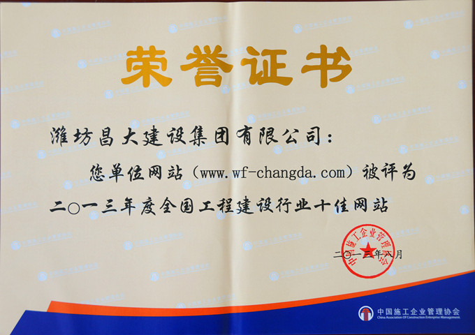 2013年8月15日至17日,中國施工企業(yè)管理協(xié)會(huì)召開年度通聯(lián)員工作會(huì)議,報(bào)告通聯(lián)年度工作,開展聯(lián)絡(luò)員通訊員交流活動(dòng),表彰優(yōu)秀報(bào)刊、網(wǎng)站,表彰優(yōu)秀聯(lián)絡(luò)員、通訊員。集團(tuán)公司官方網(wǎng)站(www.wf-changda.com)被評(píng)為2013年度全國工程建設(shè)行業(yè)十佳網(wǎng)站?!恫蠼ㄔO(shè)報(bào)》被評(píng)為全國工程建設(shè)行業(yè)銀頁報(bào)紙獎(jiǎng)。