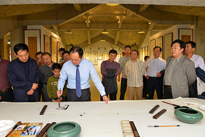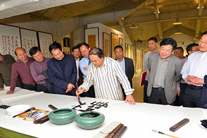 開幕式之后,與會領(lǐng)導(dǎo)、嘉賓和會員參觀了設(shè)在“昌大美術(shù)館“的劉良峰個展作品,書法家們還現(xiàn)場潑墨題字獻(xiàn)寶。另外,上午活動之余,與會人員還參觀了“泰和上筑”樓盤。