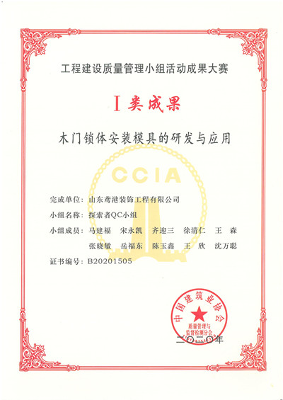 近日,中國建筑業(yè)協(xié)會頒發(fā)2020年科技成果榮譽。山東鳶港裝飾工程有限公司“探索者QC小組”的成果《木門鎖體安裝模具的研發(fā)及應(yīng)用》在本組54項成果中脫穎而出,以全組第三名的成績被評為Ⅰ類成果,獲得2020年全國一等獎。這是此小組成果繼獲得山東省建筑業(yè)協(xié)會QC成果一等獎后,又獲得的一國家級榮譽。
