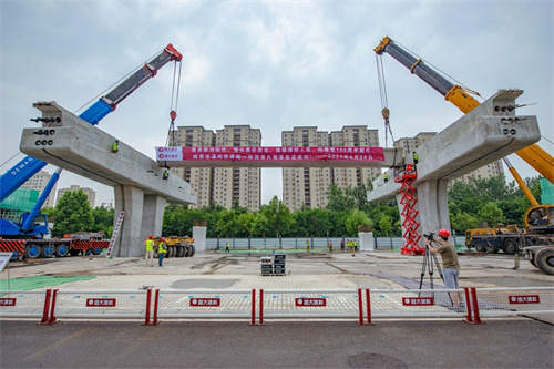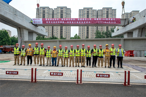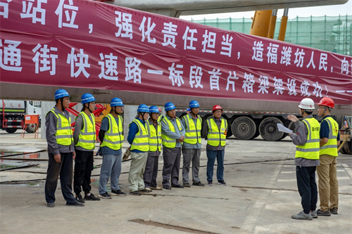 熱烈祝賀集團(tuán)寶通街快速路工程第一片預(yù)制箱梁順利吊裝完成
