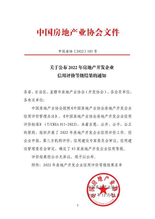 2022年12月27日,中國房地產(chǎn)業(yè)協(xié)會(huì)公布了2022年全國房地產(chǎn)開發(fā)企業(yè)信用評(píng)價(jià)等級(jí)結(jié)果,全國43家房地產(chǎn)開發(fā)企業(yè)經(jīng)嚴(yán)格、公正評(píng)審后獲評(píng)信用等級(jí)。集團(tuán)泰和置業(yè)榮獲此次信用評(píng)價(jià)的最高等級(jí)——AAA級(jí),這也是泰和置業(yè)繼2016年、2019年獲評(píng)AAA級(jí)后,再次獲得國家權(quán)威機(jī)構(gòu)的肯定。作為衡量一家企業(yè)綜合實(shí)力的重要指標(biāo),企業(yè)AAA信用評(píng)級(jí)具有極高“含金量”。依據(jù)對(duì)評(píng)估對(duì)象的信用紀(jì)錄、履約能力、經(jīng)營狀況以及專家實(shí)地核驗(yàn)等多項(xiàng)指標(biāo)的科學(xué)評(píng)估與認(rèn)證,企業(yè)信用等級(jí)越高,代表其經(jīng)營狀況、履約行為、信用紀(jì)錄越良好,是對(duì)企業(yè)信譽(yù)建設(shè)的高度認(rèn)可。企業(yè)信用評(píng)級(jí)證書有效期3年,中房協(xié)委托評(píng)價(jià)機(jī)構(gòu)對(duì)有效期內(nèi)企業(yè)每年進(jìn)行信用動(dòng)態(tài)監(jiān)測。 信用是企業(yè)寶貴的無形資產(chǎn),也是企業(yè)的誠信名片和市場通行證。泰和置業(yè)多次獲評(píng)最高信用等級(jí),充分體現(xiàn)了泰和置業(yè)在誠信經(jīng)營方面的重視與堅(jiān)守,以“品質(zhì)”為基石,嚴(yán)格把控產(chǎn)品規(guī)劃設(shè)計(jì)、建設(shè)、銷售和服務(wù)的各個(gè)環(huán)節(jié),精于勤,作于細(xì),方寸之間,匠心盡顯。同時(shí)也說明,集團(tuán)各參建單位在統(tǒng)一協(xié)調(diào)配合等方面出色和卓越的工作。