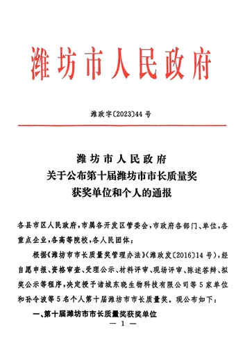 2023年11月27日,濰坊市人民政府公布了第十屆濰坊市市長質(zhì)量獎獲獎名單,根據(jù)《濰坊市市長質(zhì)量獎管理辦法》(濰政發(fā)〔2016〕14號),經(jīng)自愿申報、資格審查、受理公示、材料評審、現(xiàn)場評審、陳述答辯、擬獎公示等程序,集團公司榮獲第十屆濰坊市市長質(zhì)量獎。