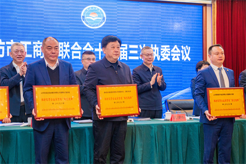 2024年3月22日上午,濰坊市工商聯(lián)十三屆三次執(zhí)委會(huì)在金茂國(guó)際大酒店召開(kāi)。集團(tuán)公司總裁朱九洲出席會(huì)議并作為濰坊民營(yíng)企業(yè)家百名“敢創(chuàng)先鋒”代表上臺(tái)領(lǐng)獎(jiǎng)。