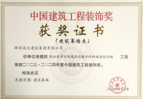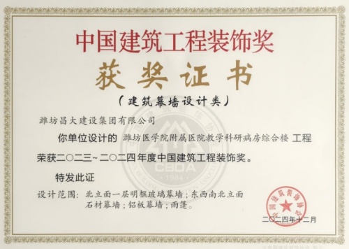 2024年12月10日,中國建筑裝飾協(xié)會在北京召開大會,表彰2023~2024年度“中國建筑工程裝飾獎”工程。集團裝飾幕墻工程公司、山東鳶港裝飾工程有限公司的三項工程榮獲五個獎項:濰坊醫(yī)學院附屬醫(yī)院教學科研病房綜合樓(建筑幕墻類和幕墻設計類)、濰坊市婦女兒童健康中心病房樓(公共建筑裝飾類和公共建筑裝飾設計類),柒星國際2#住宅樓(建筑幕墻類)。